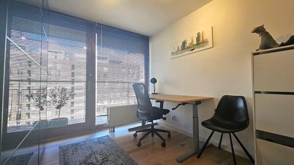 The apartment features one spacious bedroom with a stylish wardrobe and a separate office/study, ideal for those working from home or having guests. Both rooms open onto the balcony, allowing you to enjoy the view and fresh air from there as well.